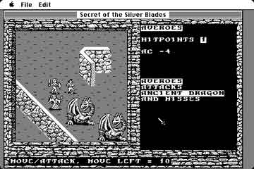 Secret of the Silver Blade suit très classiquement ce que l'on attend d'un jeu basé sur Donjons et Dragons, il est la troisième partie de Forgotten Realms. La qualité graphique est on ne peut plus minimale, par contre le reste est là, c'est-à-dire un bon scénario pour les amateurs de jdr. |