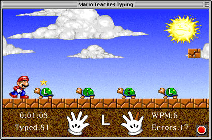Profitant de l'engouement des mômes pour Mario, Nintendo a sorti sur PC et, porté par Macsoft, sur Mac, ce didacticiel destiné aux enfants, afin de les motiver dans l'apprentissage du clavier. Seul problème, pour nous autres pauvres Français, le jeu est plutôt adapté aux clavers qwerty, certaines combinaisons s'avèrent donc peu adaptées, et surtout, les caractères spéciaux (type accents) ne sont pas travaillés. Cependant, cela peut être un jeu amusant pour une première découverte des touches. |